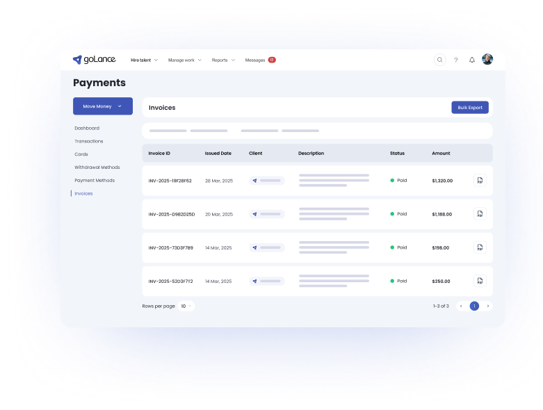 Whether you’re billing for a milestone, a fixed-price job, or missed tracked hours, goLance lets you send invoices directly from your dashboard—fast, easy, and secure.